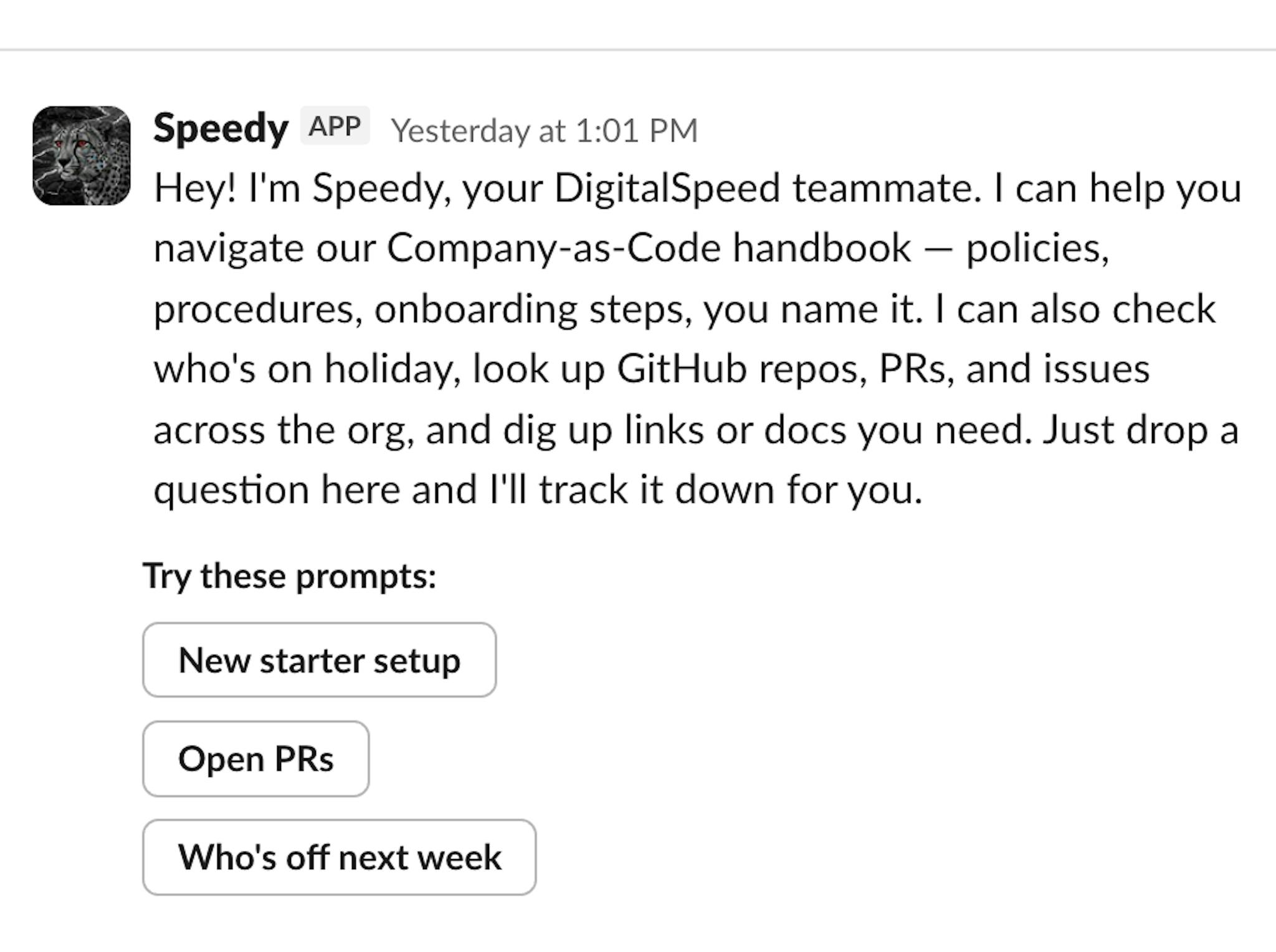 Meet Speedy — a teammate that never sleeps, never forgets where the docs are, and always replies like a colleague who actually wants to help. Speedy is an AI-powered Slack bot that sits right inside our team's DMs and channels, ready to answer the questions we all have but nobody wants to chase down: "I just joined — how does onboarding work?", "Who's off next week?", or "Where's that deployment guide again?" These are exactly the kind of things that eat into everyone's day. Not because they're hard, but because finding the answer means digging through docs, pinging someone, and waiting. Speedy cuts that overhead by searching our Company-as-Code handbook and pulling live data from tools like Productive.io to surface answers in seconds — so the rest of the team can get back to the work that actually needs them.